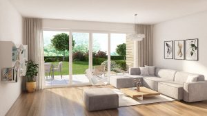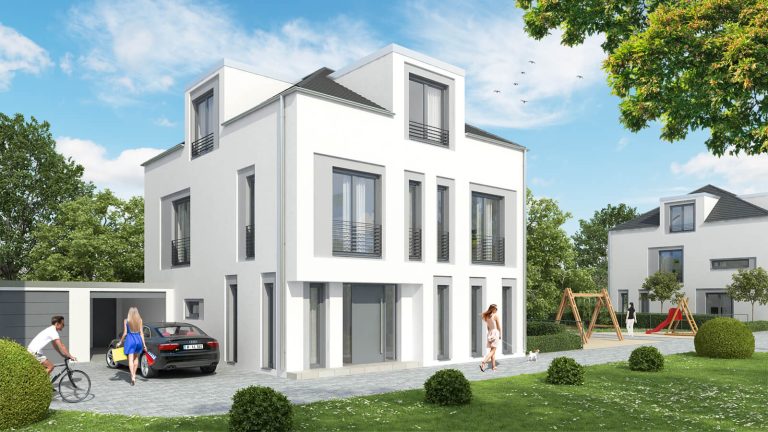 Markante Putzfaschen um die Fenster akzentuieren die weiß gestrichenen Fassaden. Die schwarzen Zeltdächer kontrastieren elegant und sind wie die Außenmauern mit einem leistungsfähigen Wärmedämmsystem ausgestattet. Regenrinnen, Fallrohre und Anschlussstücke werden vor allem in hellgrauem Zinkblech ausgeführt. Modern gestaltet, klassisch gebaut Die Haustüre ist innen weiß und außen anthrazit. Die vertikale Griffstange aus glänzendem Edelstahl setzt sich markant ab. Für die Fenster werden hochwertige Kunststoffrahmen eingesetzt, die alle Anforderungen des Wärmeschutznachweises (GEG) erfüllen. Ihre Oberflächen sind innen weiß, außen mittelgrau. Sie sind mit Isolierverglasung ausgestattet und erhalten elektrische Rollläden mit Kunststoffpanzer in Grau – bis auf die Keller- und Dachflächenfenster. Alle Bäder überzeugen mit hochwertigen WC-Anlagen und Waschtischen von »Geberit Renova Plan«, die Armaturen stammen von Grohe, die Badewannen gehören zur Serie »Bette Classic«. Beide Haustypen sind funktional konzipiert, verfügen über moderne Haustechnik und sind gestalterisch der klassischen Moderne verpflichtet Lieber eine kompakte Doppelhaushälfte oder ein großzügiges Einfamilienhaus? Wohnfläche der Doppelhaushälften: ca. 150 qm. In Bädern, WCs, Küchen und Eingangsbereichen werden keramische Fliesen verlegt – abgeschlossen mit passenden umlaufenden Sockelfliesen. Eine Luft-/Wasser-Wärmepumpe mit Warmwasserspeicher sorgt über eine angeschlossene Fußbodenheizung mit Einzelraumregelung für wohlige Wärme vom Erdgeschoss bis ins Dachgeschoss. Der TÜV Rheinland wird ein baubegleitendes Qualitätscontrolling durchführen.